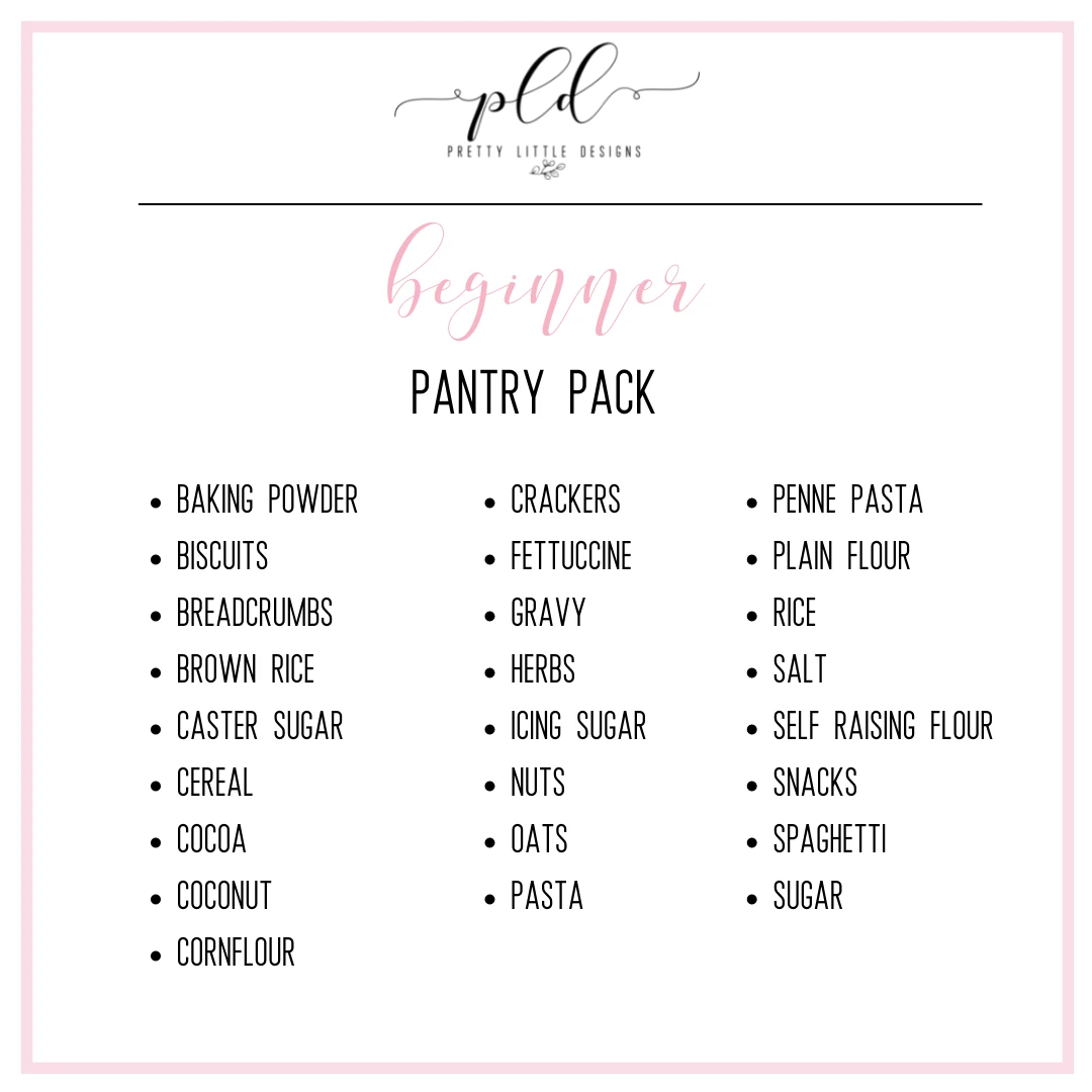 Beginner Starter Pantry Packs: Baking Powder, Biscuits, Breadcrumbs, Brown Rice, Caster Sugar, Cereal, Cocoa, Coconut, Cornflour, Crackers, Fettuccine, Gravy, Herbs, Icing Sugar, Nuts, Oats, Pasta, Penne Pasta, Plain Flour, Rice, Salt, Self Raising Flour, Snacks, Spaghetti, Sugar