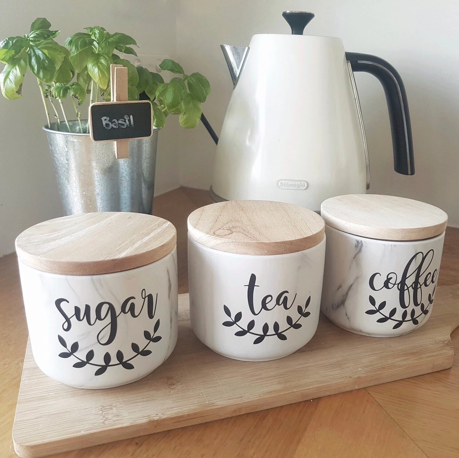 Why not jazz up your kitchen with these gorgeous tea, sugar and coffee canister labels. In this label pack, you’ll get 3 self adhesive labels for Tea, Coffee and Sugar. These labels are approximately 8cm x 3cm in size and fit perfectly on most all Canister lids and Kmart Canister Lid. Sold in sets of 3 or singles labels.