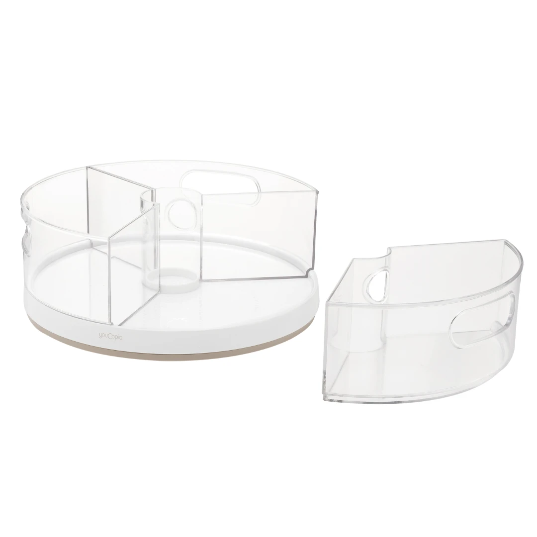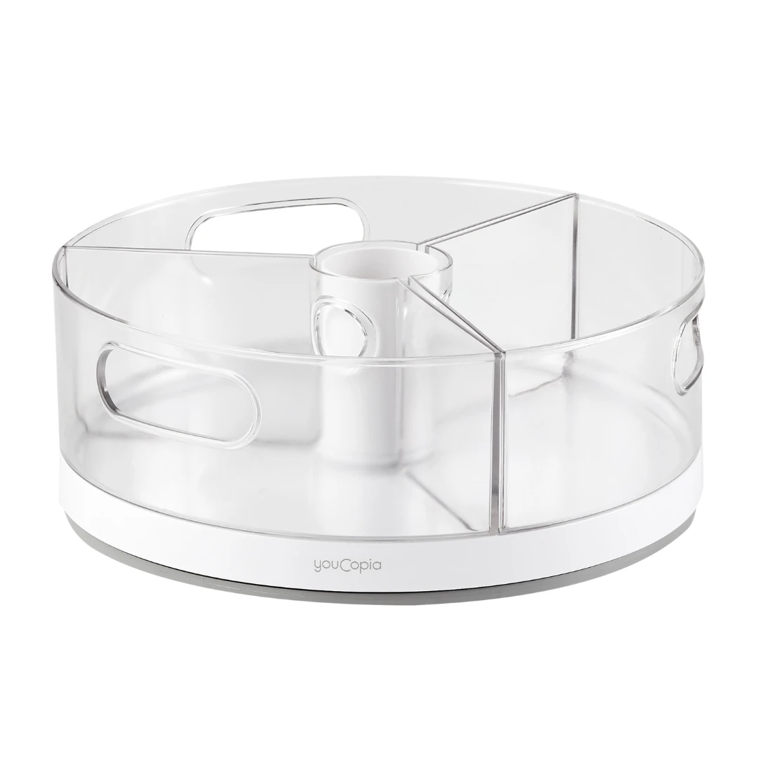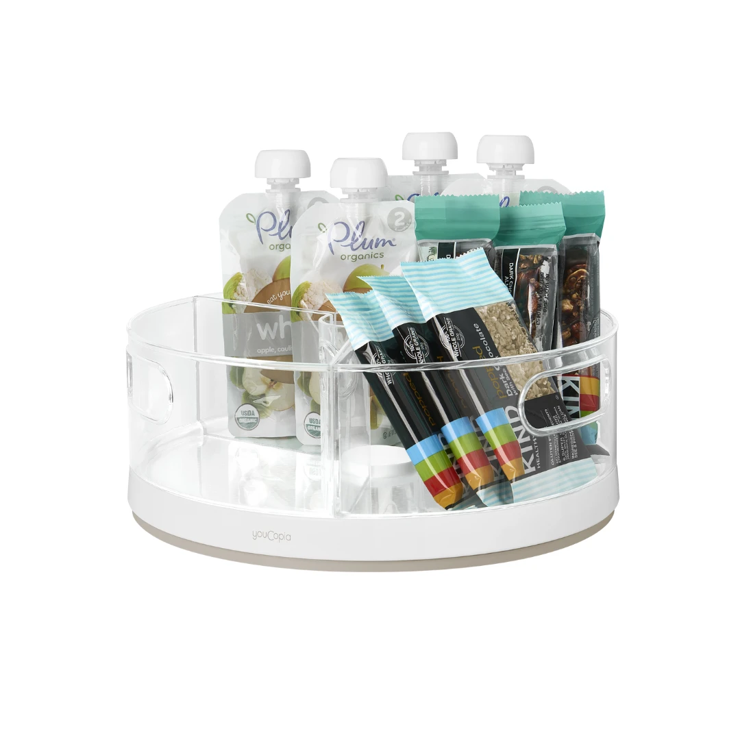 The Crazy Susan® Turntable from YouCopia keeps small items like snacks, packets, pods and bottles organised and easily accessible. Featuring 3 generous size clear, removable bins with handles, you can quickly spin, see and select what you’re after. This turntable utilises durable and hard-wearing stainless steel ball bearings and non-slip feet for a smooth and stable rotation everytime.